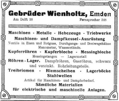| 11:00, 12. Okt. 2025 | Delft18 Wienholtz 1911-2.jpg (Datei) | 23 KB | Reproduktion durch JPB: Geschäftsanzeigen. Quelle: Adressbuch der Stadt Emden 1911. == Lizenz == {{repro-cco}} | 1 | |