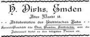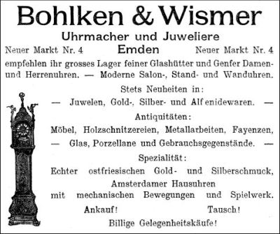 | 11:08, 12. Okt. 2025 | NeuerMarkt4 Bohlken-Wismer 1911.jpg (Datei) | 32 KB | Reproduktion durch JPB: Geschäftsanzeigen. Quelle: Adressbuch der Stadt Emden 1911. | 1 | |