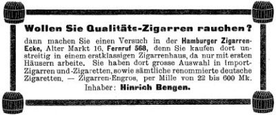 | 10:43, 12. Okt. 2025 | AlterMarkt16 Bengen-Zigarren 1911.jpg (Datei) | 20 KB | Reproduktion durch JPB: Geschäftsanzeigen. Quelle: Adressbuch der Stadt Emden 1911. | 1 | |