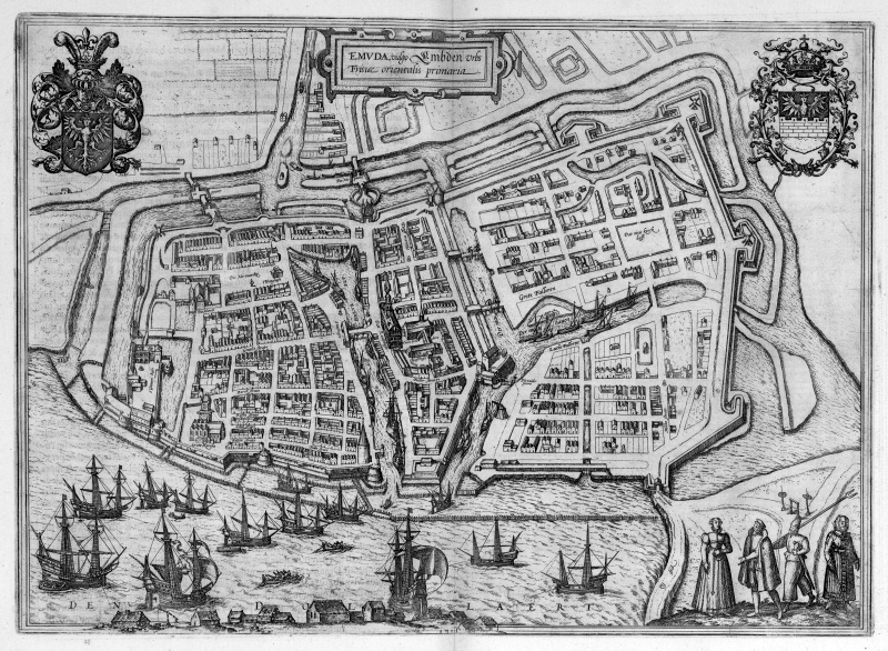 "Embdena, Embden urbs Frisiæ orientalis Primaria", 1575, Georg Braun und Frans Hogenberg. Kartensammlung der Gottfried Wilhelm Leibniz Bibliothek, URL: https://kartenspeicher.gbv.de/item/gwlb_mods_00010983. Lizenz: Public Domain.
