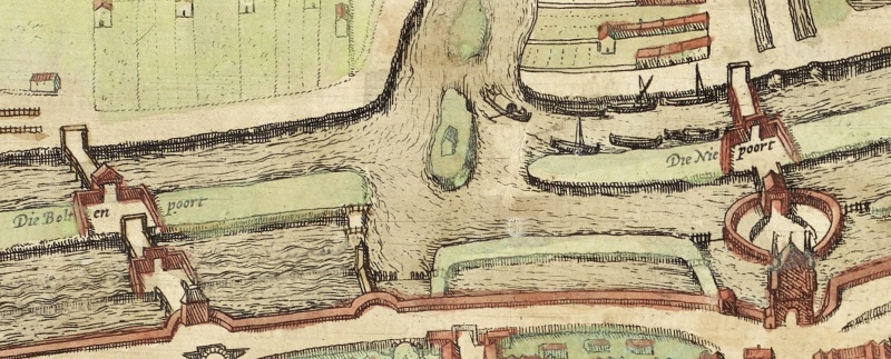 Auszug aus: "Embden urbs Frisiae orientalis primaria", 1576, (kolorierter Kupferstich) Autoren: Braun, Georg und Hogenberg, Franz. Gottfried Wilhelm Leibniz Bibliothek - Niedersächsische Landesbibliothek; URL: https://kartenspeicher.gbv.de/item/gwlb_mods_00010983
