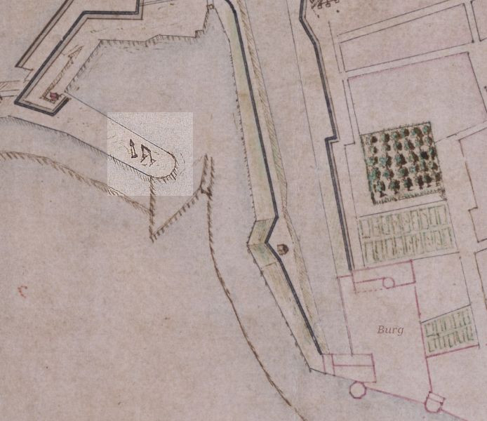 Herkunft: NLA AU Rep. 244 B Nr. 876. Auszug aus: Wübbo Coens (ca. 1694): Plan de la Ville de Embden. Publikation nur nach Zustimmung!