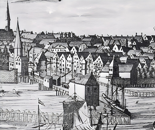 Auszug aus: "Ansicht der Stadt um das Jahr 1730", nach einem Kupferstich von F. B. Werner. Bearbeitung und Reproduktion: JPB