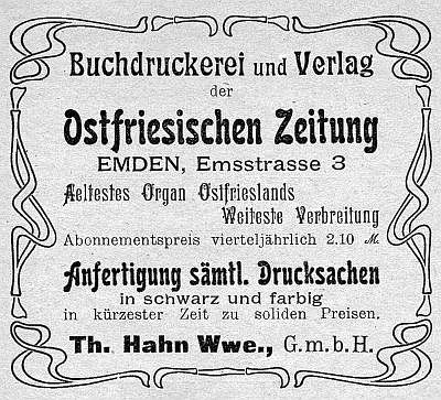 Reproduktion: JPB; Geschäftsanzeige; Herkunft/Quelle: Verein zur Förderung des Fremdenverkehrs (1906): Kurzer Ratgeber und Führer durch Emden; Verlag: Schwalbe, Emden.