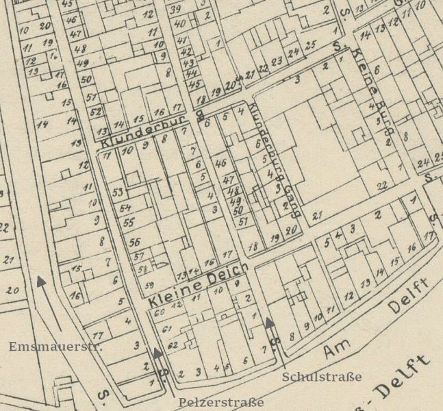 Reproduktion/Auszug JPB: Stadtplan Emden, 1911, Verlag Walter Schwalbe († 1930) Emden, (gezeichnet von Stadtbautechniker H. Braa).